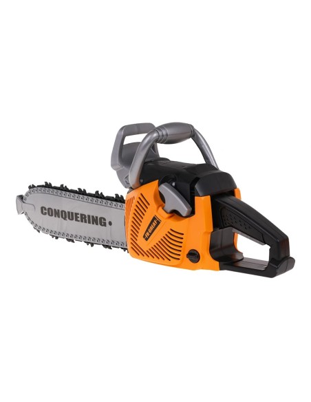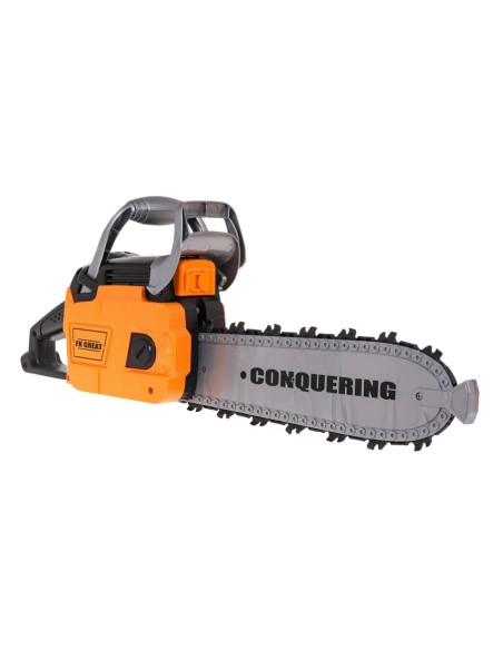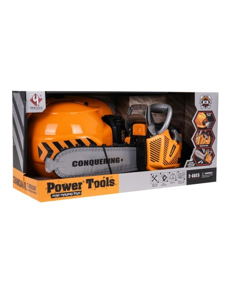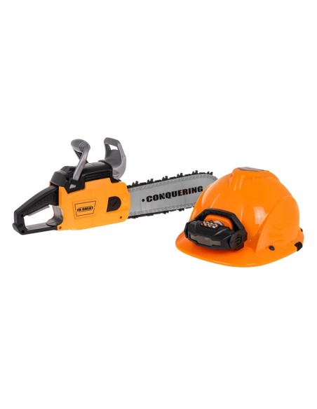 Interaktyvus grandininių pjūklų komplektas su garso efektais ir šalmas su žibintuvėliu skirtas vaikams nuo 3 metų. Pjūklas yra visiškai saugus vaikams. Jis pagamintas iš aukščiausios kokybės plastiko ir neturi aštrių kraštų. Grandinė pagaminta iš gumos. Norėdami užvesti pjūklą, patraukite už starterio laido ir išgirsite variklio užvedimo garsą. Norėdami įjungti grandinę, paspauskite ir palaikykite apatinį mygtuką ant rankenos. Grandinė pradės suktis ir skleis pjovimo garsus. Komplekte yra šalmas su reguliuojama lempa ir smakro dirželis. Pjūklas maitinamas 3 x AAA 1,5 V baterijomis, baterijos neįeina. Šalmas maitinamas 3 X AG13 baterijomis, baterijos įtrauktos.