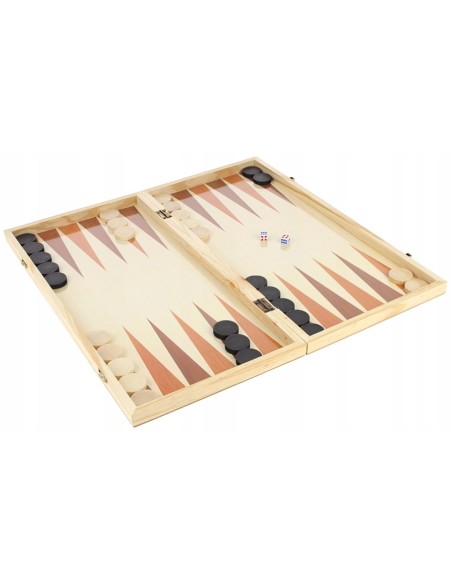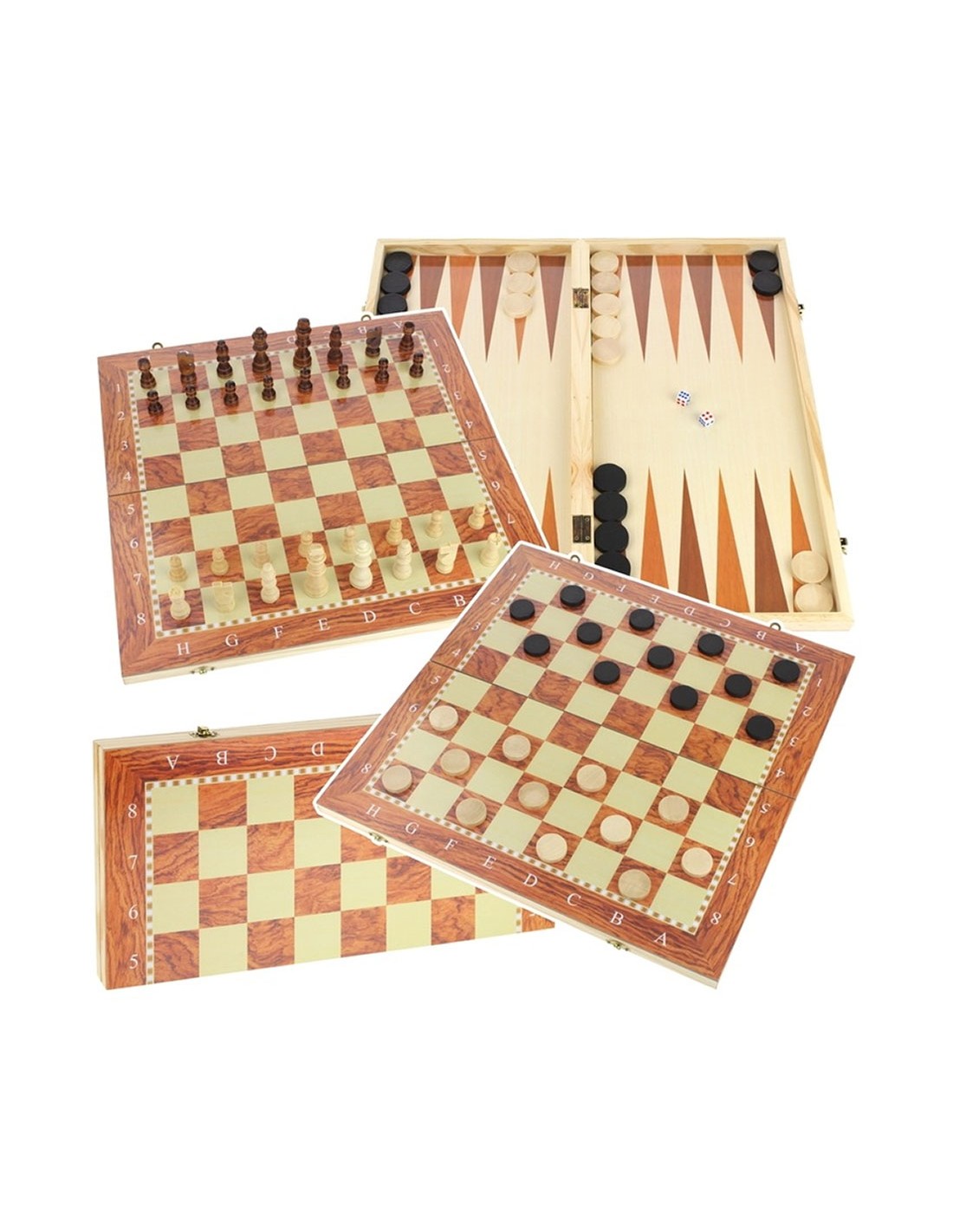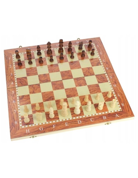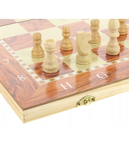 Klasikinis 3-in-1 medinis žaidimų komplektas: šachmatai, šaškės ir nardai. Sulankstoma lenta patogiam figūrų laikymui. Kokybiškas laisvalaikis tiek namuose, tiek kelionėje.