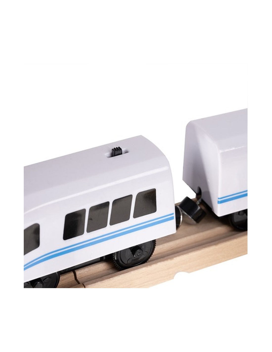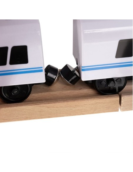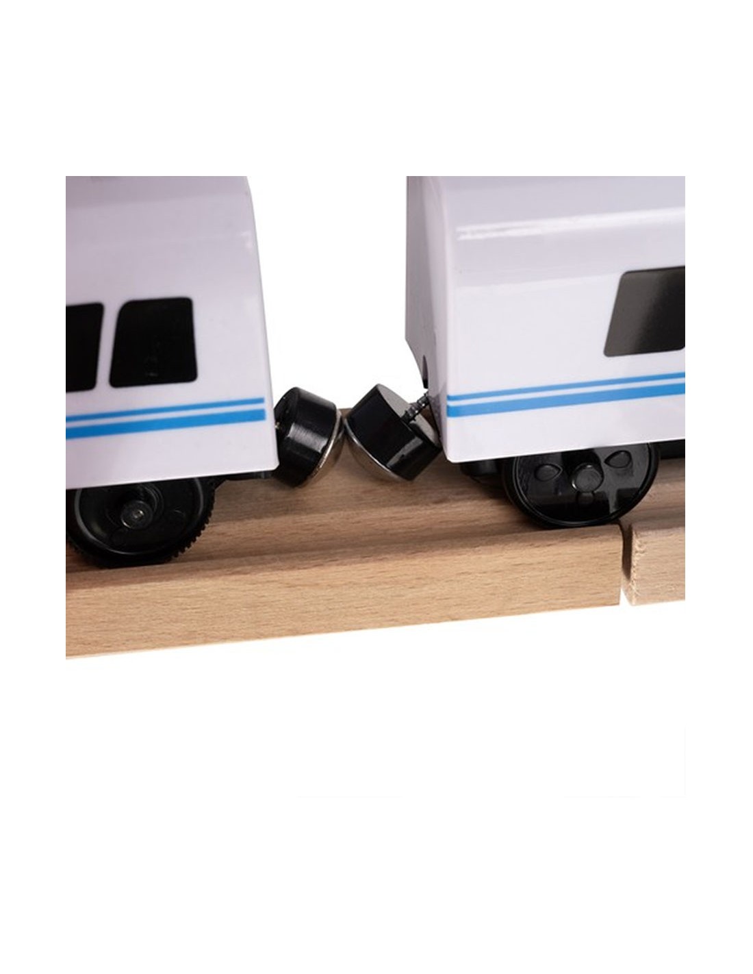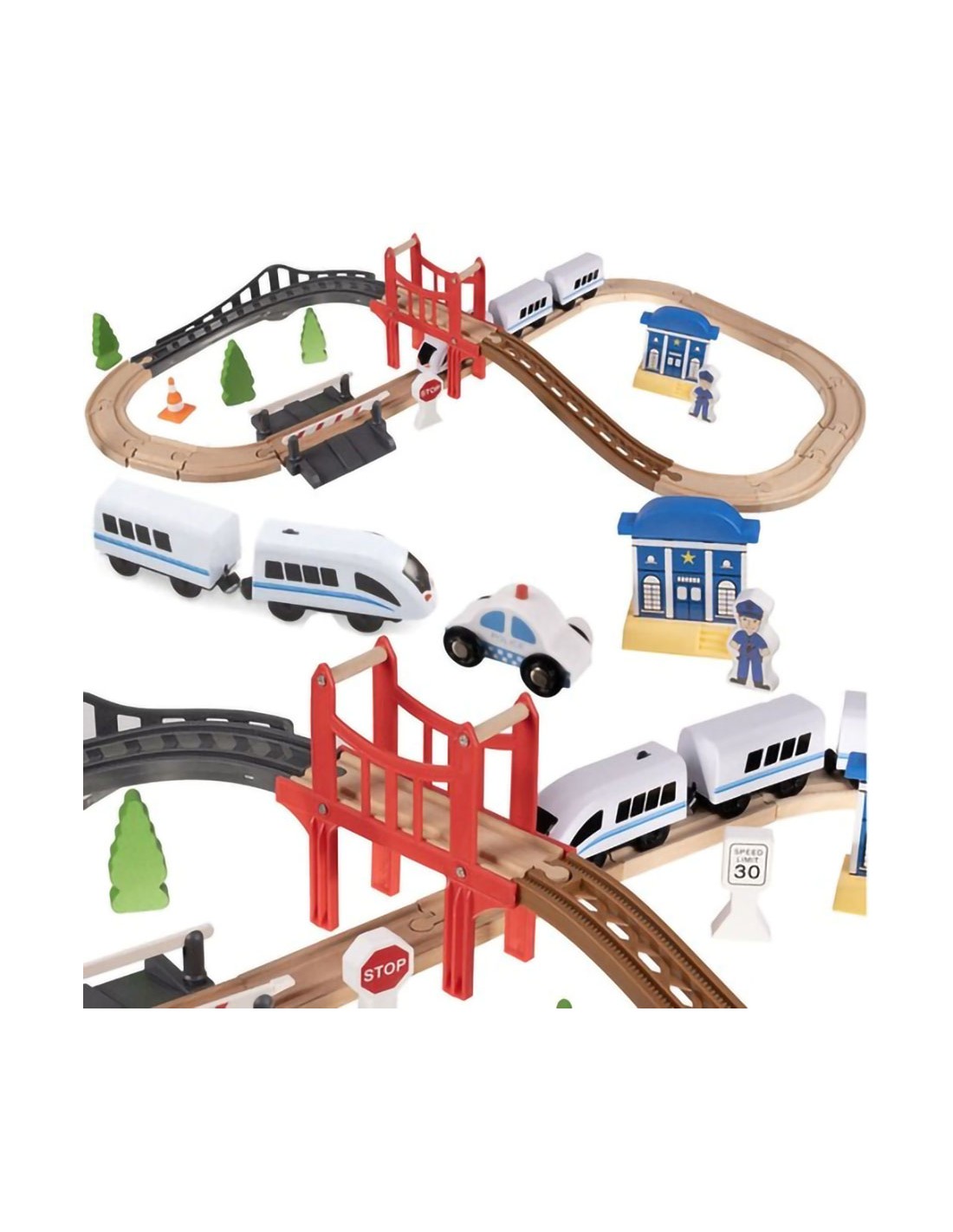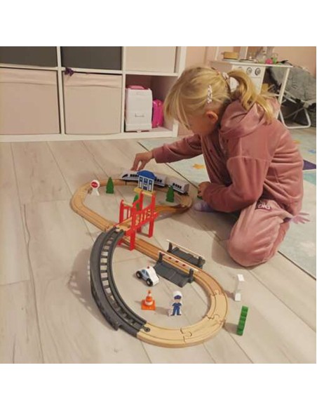 37 ELEMENTAI – rinkinį sudaro 37 tiksliai pagaminti ir gražiai išbaigti elementai, kurias galima sutvarkyti pagal savo idėjas . Rinkinį sudaro keleivinio traukinio bėgiai, policijos automobilis, medžių ir ženklų rinkinys, policininkas, ženklai ir daug daugiau. Traukinio ir traukinio elementai yra sujungti magnetukais – nėra nereikalingų kabliukų, kurie galėtų nutrūkti ir vaikui nuolat sukelti problemų atjungti komplektą. Magnetai yra stiprūs – jie nepaleidžia net pakėlus visą komplektą.