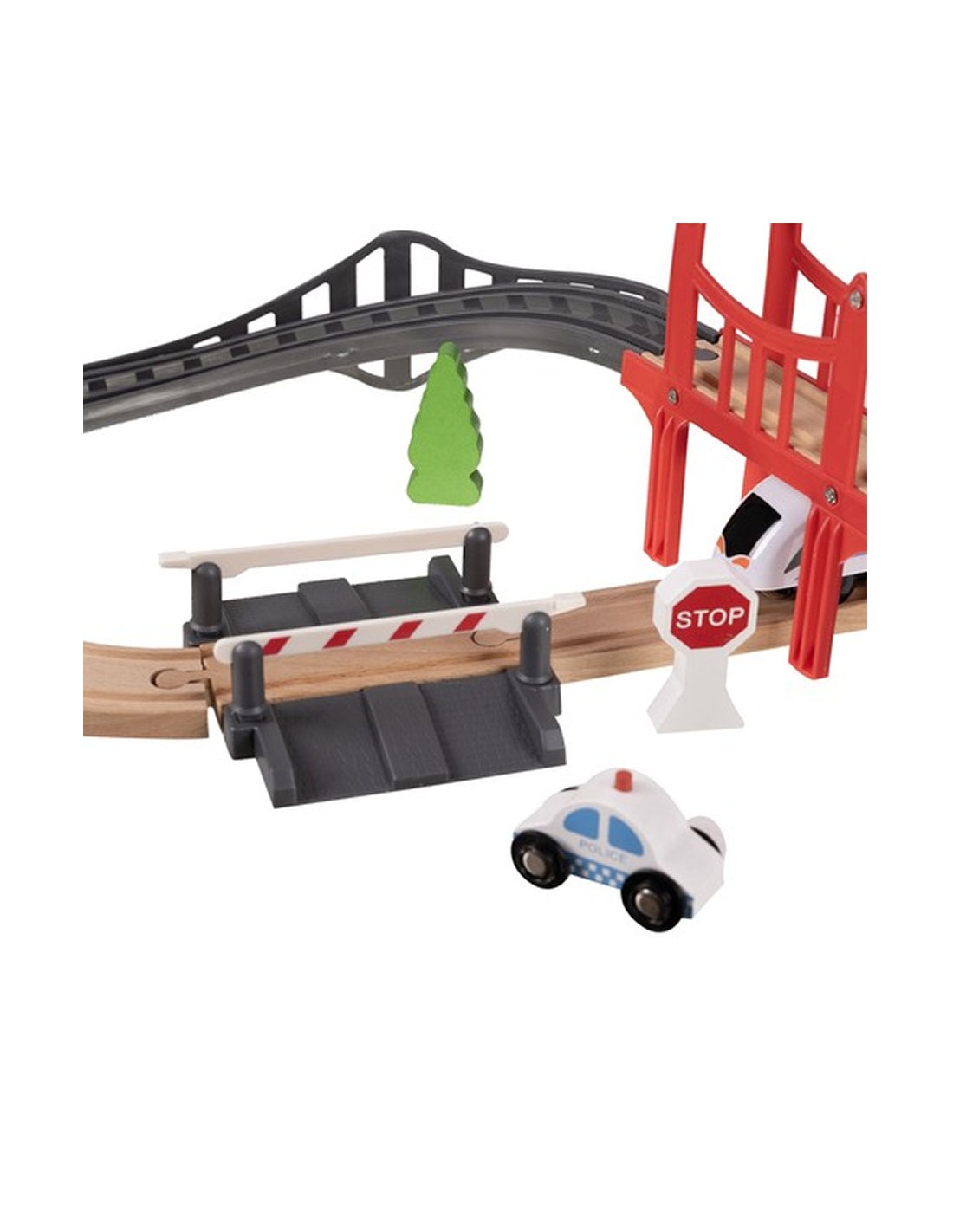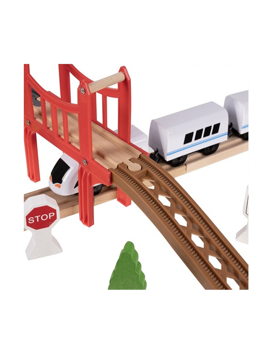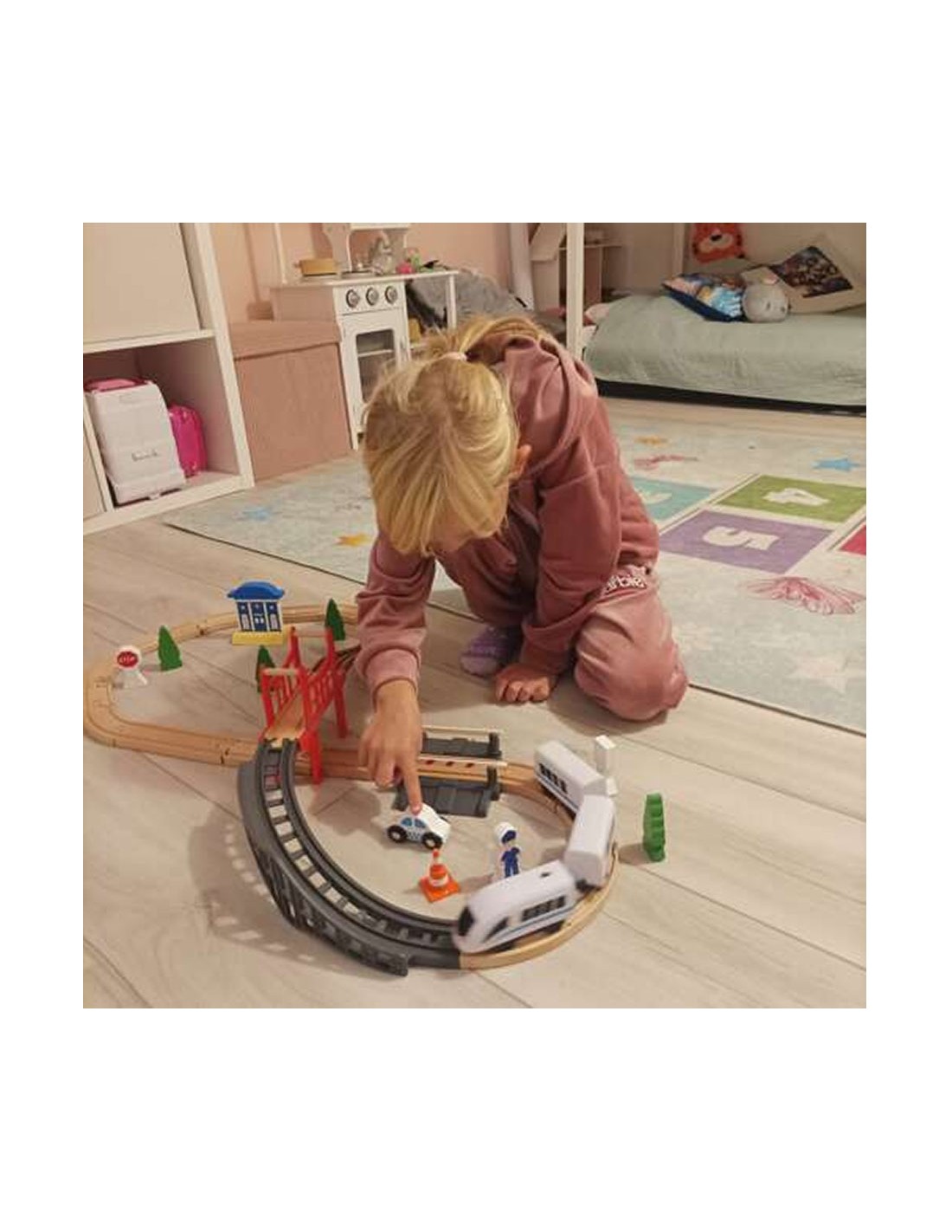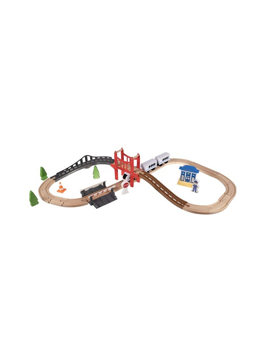 Medinė traukinių/automobilių trasa – tikras malonumas mažiesiems! Spalvingi elementai, iš kurių kuriami nepaprasti peizažai. Gausus rinkinys – net 37 elementų! - suteikia praktiškai neribotas kūrybines galimybes.