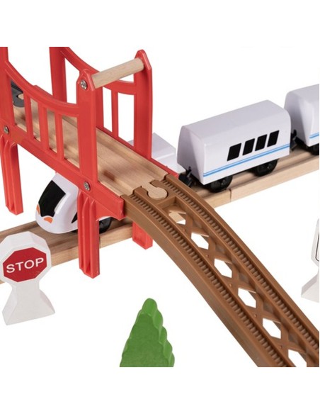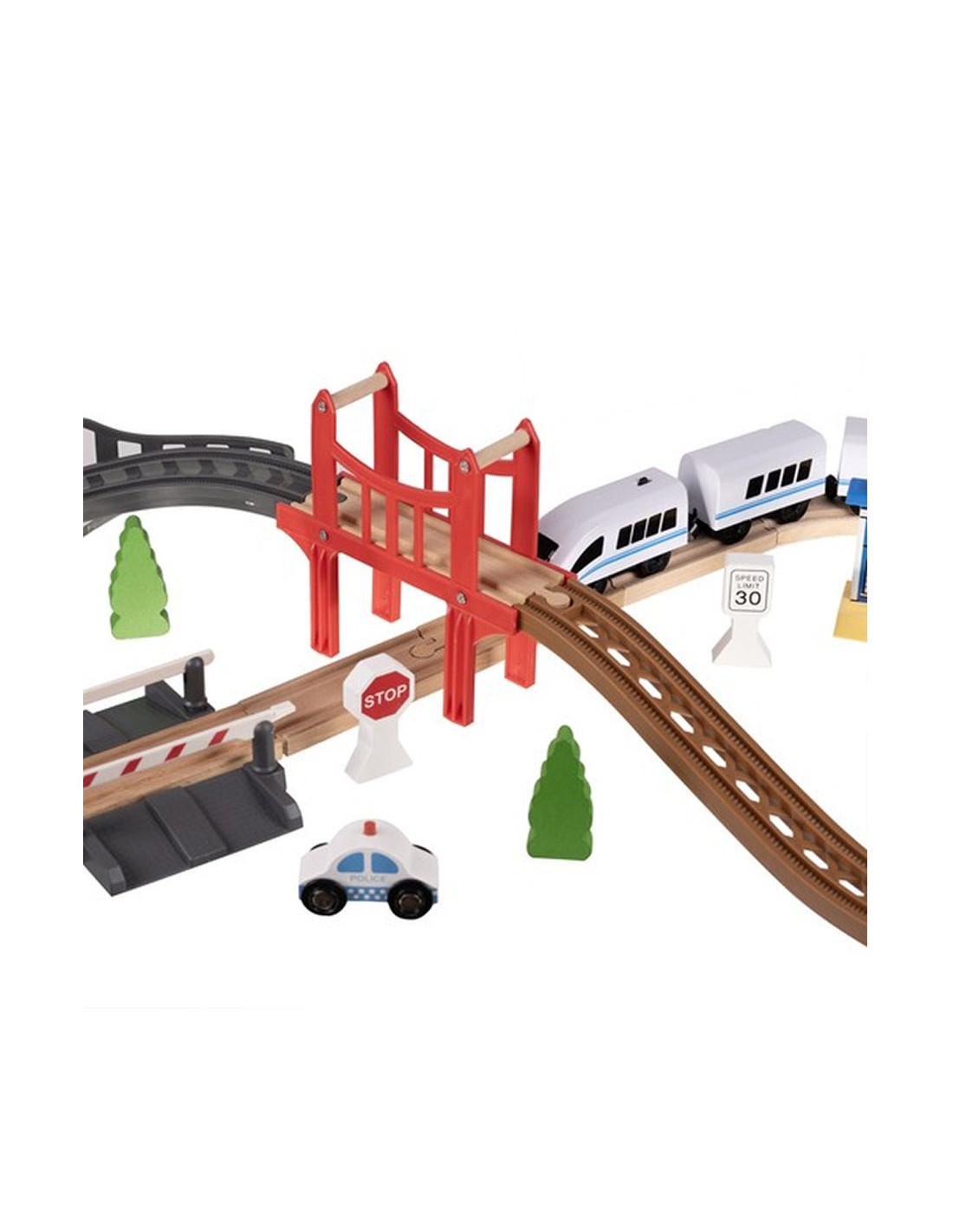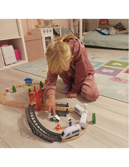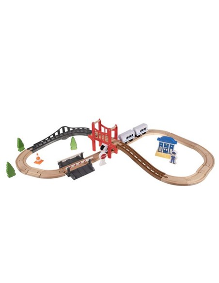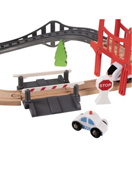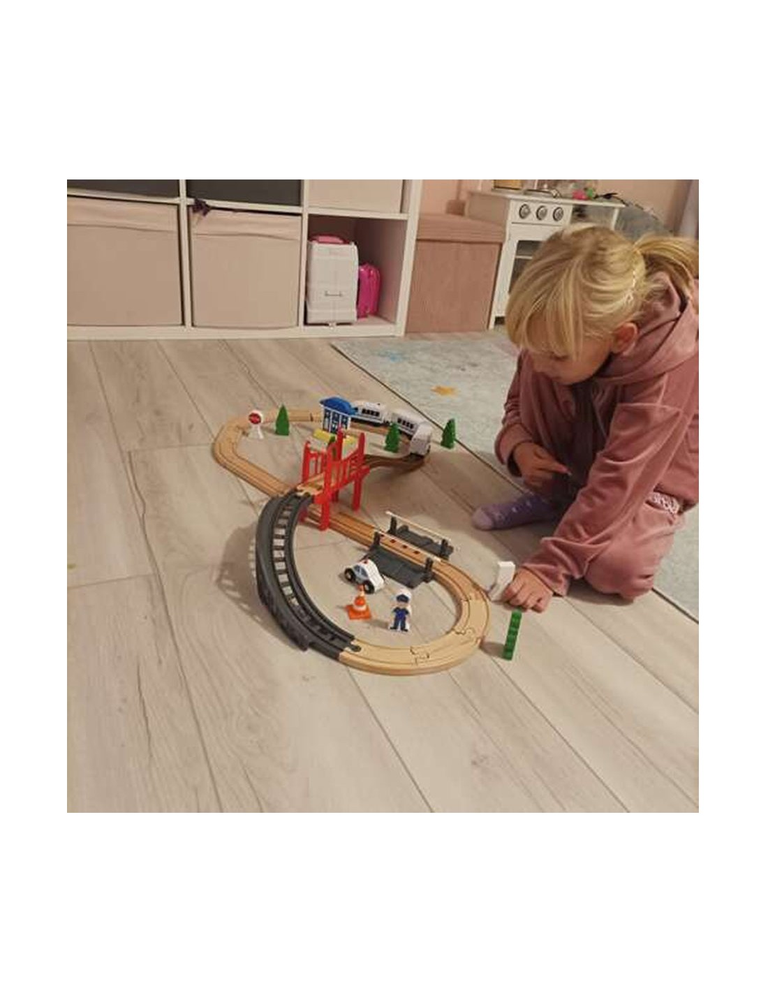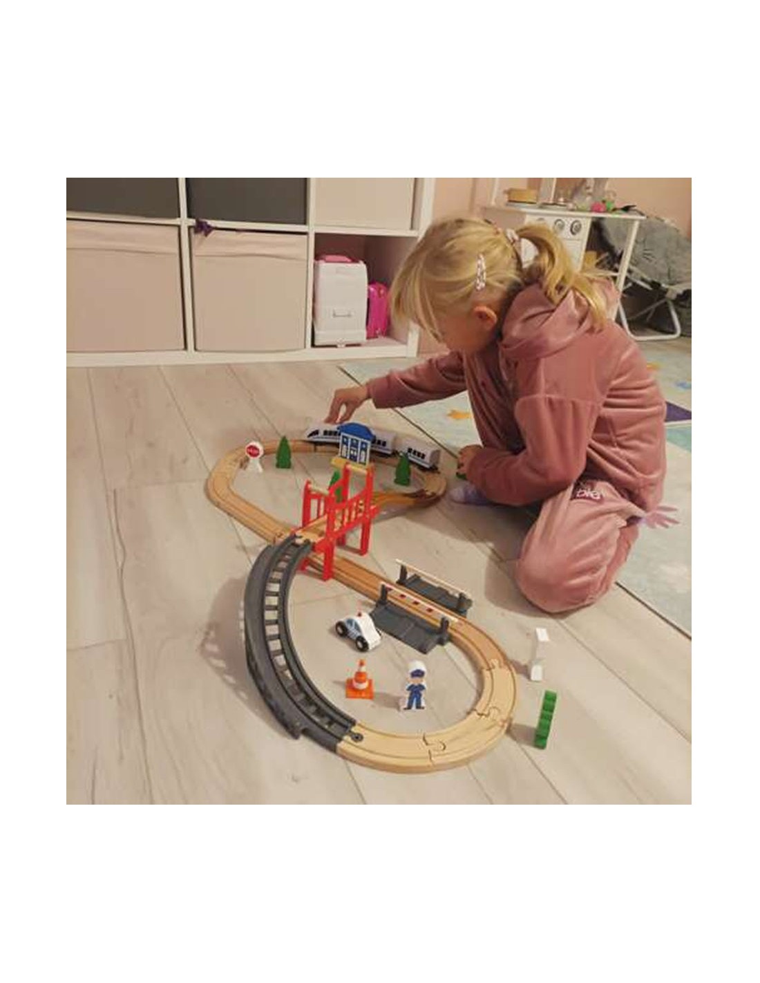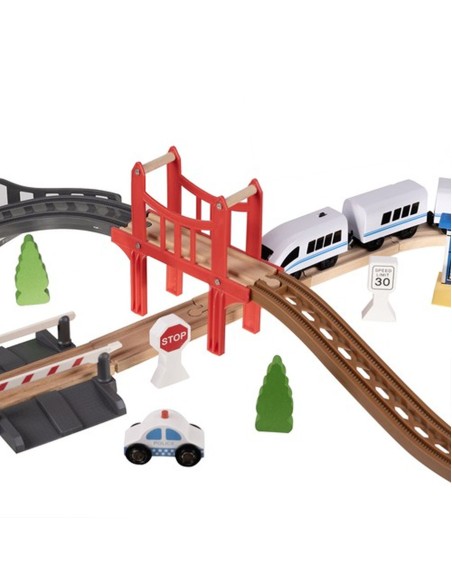 Medinė traukinių/automobilių trasa – tikras malonumas mažiesiems! Spalvingi elementai, iš kurių kuriami nepaprasti peizažai. Gausus rinkinys – net 37 elementų! - suteikia praktiškai neribotas kūrybines galimybes.