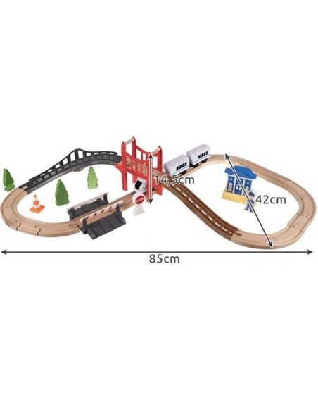 SPECIFIKACIJA – medžiaga: mediena; traukinio maitinimas: 1x AA (į komplektą neįeina); elementų skaičius rinkinyje: 37; takelio ilgis: 3,2 m; išmatavimai išskleidus: 85 x 42 x 14,5 cm; svoris: 1,261 kg; svoris su pakuote: 1,38 kg.